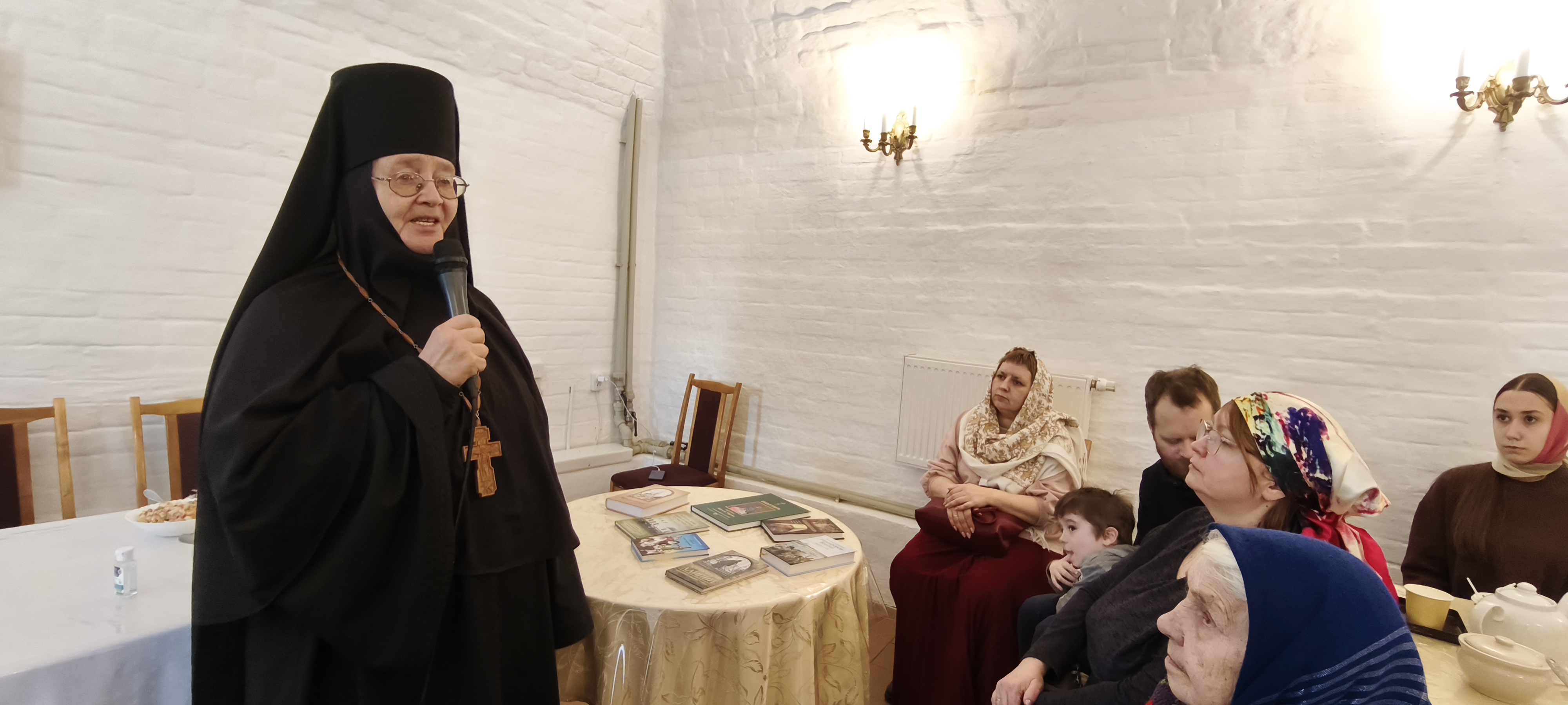 В воскресенье 8 марта в Спасо-Преображенском женском монастыре на р. Угре в г. Калуге по адресу Калуга, Пригородная зона, с. Спас, 43а, прошла беседа с прихожанами, в ходе которой игуменья Анастасия поздравила прихожан с наступающим праздником Днем Православной книги, и рассказала о новинках православной литературы.