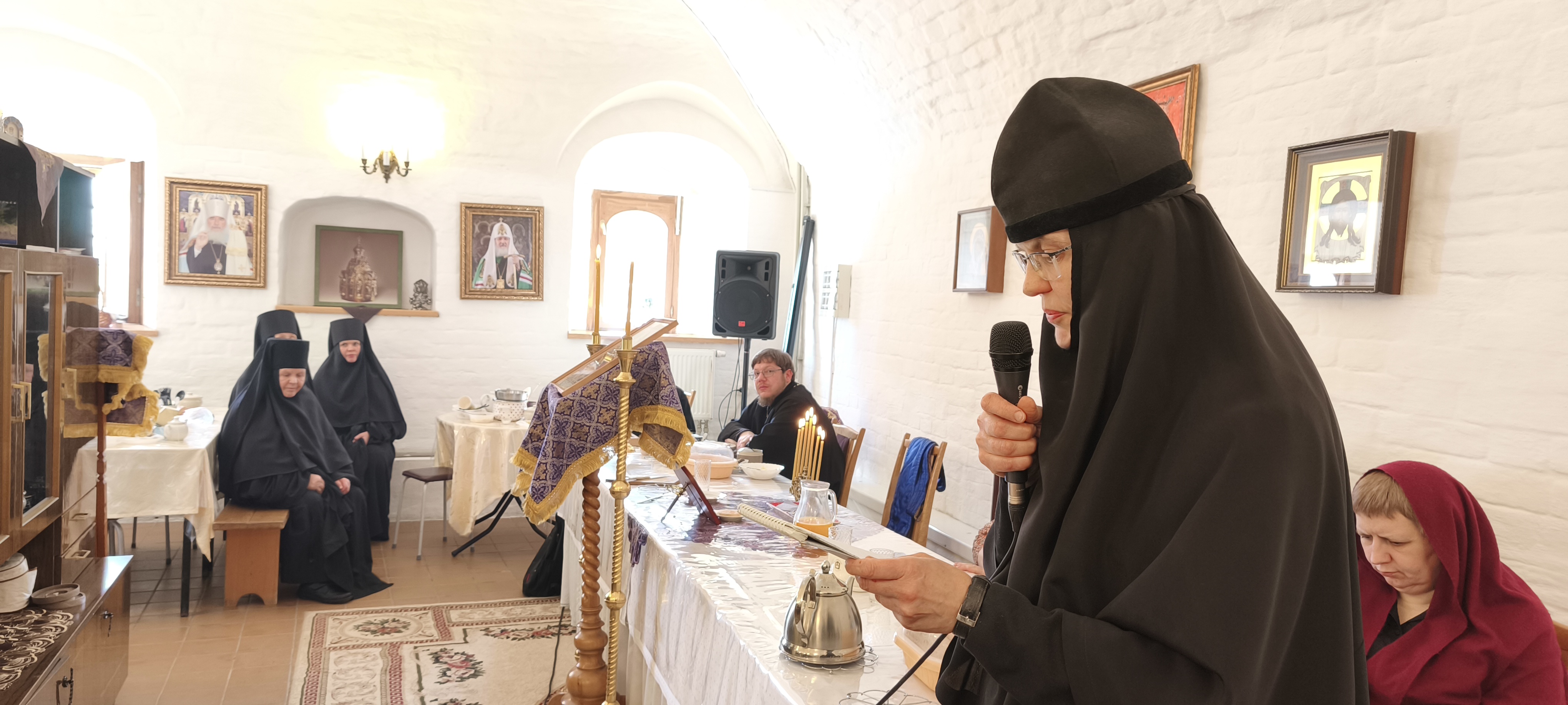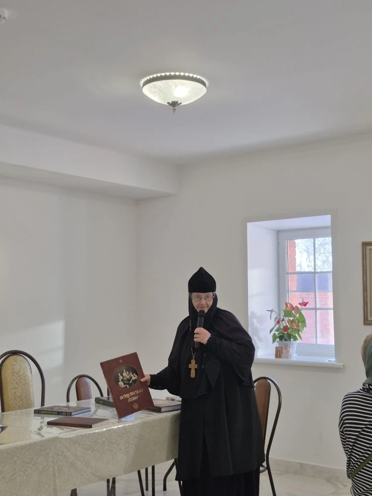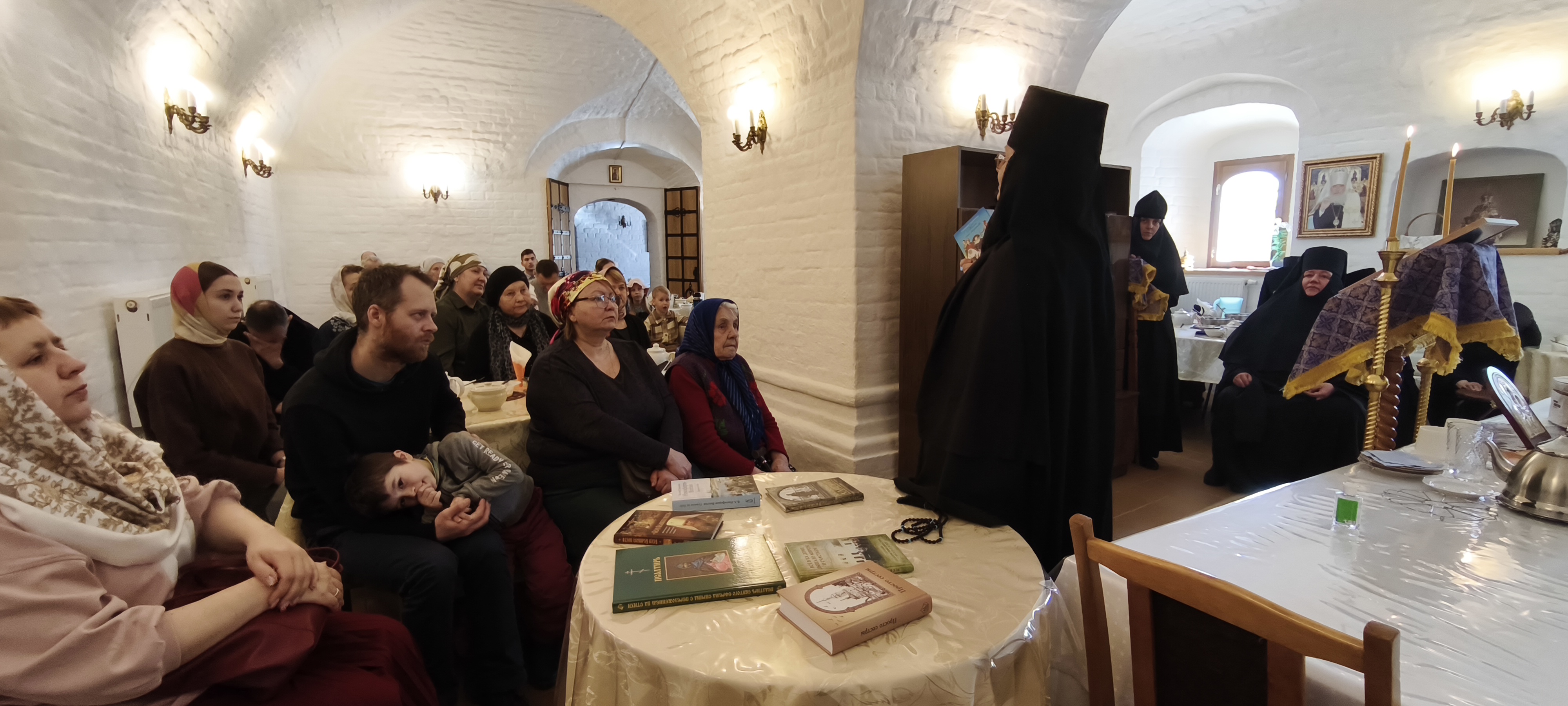 Пятнадцатого марта в Спасо-Преображенском женском монастыре на р. Угре в г. Калуге по адресу Калуга, пригородная зона, с. Спас, 43а после воскресного чина о панагии в трапезной монастыря прошла беседа с сестрами и прихожанами об уникальных изданиях, хранящихся в библиотеке монастыря, посвященных Новомученникам и Исповедникам Российским.