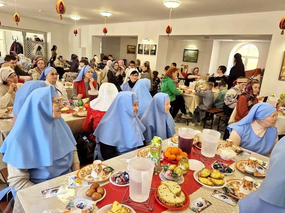 Потом все в радостном пасхальном настроении отправились в монастырскую трапезную, где был накрыт пасхальный стол с куличами, пасхами и другими угощениями. За чаепитием игумения Анастасия побеседовала со всеми о том, как встречать Пасху с очищенным сердцем, как делиться со всеми пасхальной радостью.